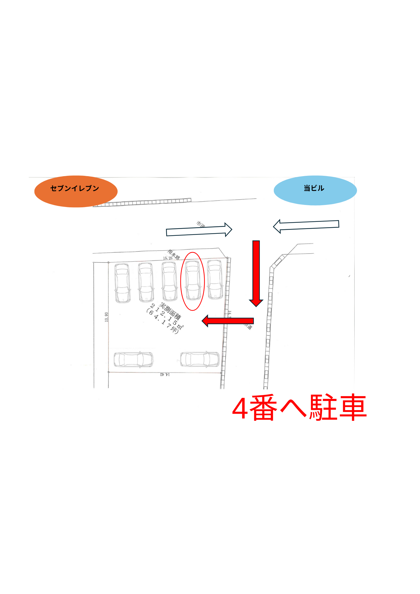 ビル前の4番または来客用に停められない場合は、ビル斜め向かいの駐車場の4番へ駐車場お願いいたします。